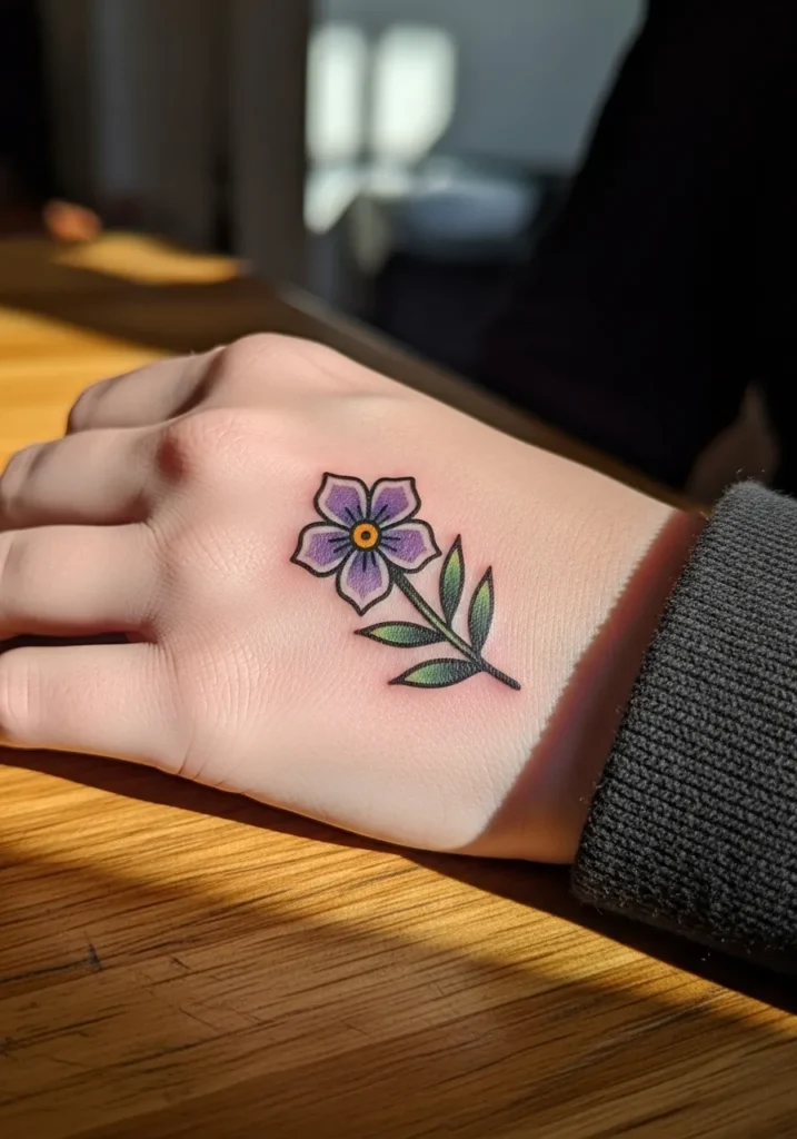 This delicate American Traditional tattoo sits right on the hand, featuring a small purple bloom with green leaves. The clean black outlines and soft gradient shading make it both minimal and eye-catching. It s the perfect size for a subtle yet stylish floral touch.