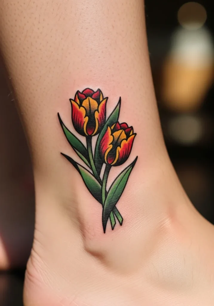 This ankle tattoo features two vivid American Traditional tulips, blending shades of yellow, orange, and red with bright green leaves. The piece is compact but full of life, standing out beautifully against the skin. The design s placement near the ankle gives it a playful yet graceful charm.