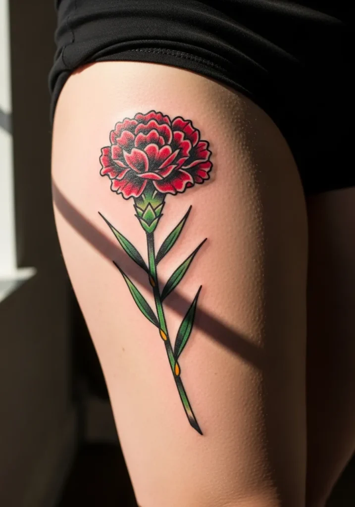 This thigh tattoo features a tall red carnation with layered petals and long green leaves. The bold contrast between the bright red flower and the black-lined stem gives it that classic American Traditional punch. It s elegant, balanced, and full of vintage flair.
