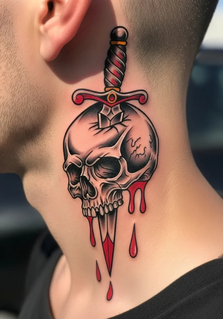 This striking neck tattoo features a bold skull pierced by a dagger, dripping with vivid red ink that mimics blood. The clean black outlines and soft shading give it a crisp, traditional feel, while the red accents add that extra punch of drama. It s a medium-sized piece that follows the curve of the neck perfectly, giving it a fierce yet balanced look.