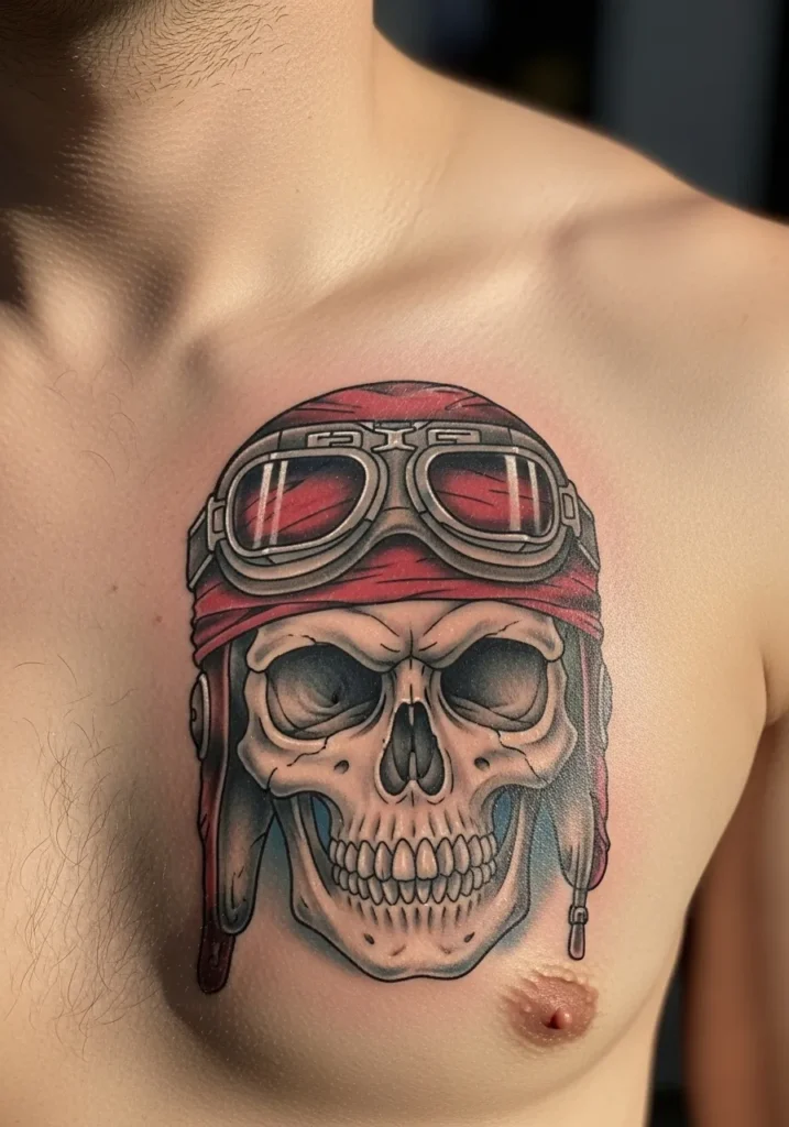 This chest tattoo is packed with personality, featuring a skull wearing a vintage pilot helmet and red goggles. The bold shading and strong black outlines give it that perfect American traditional feel, while the pops of red tie everything together. The placement over the chest makes it feel centered, confident, and full of life.