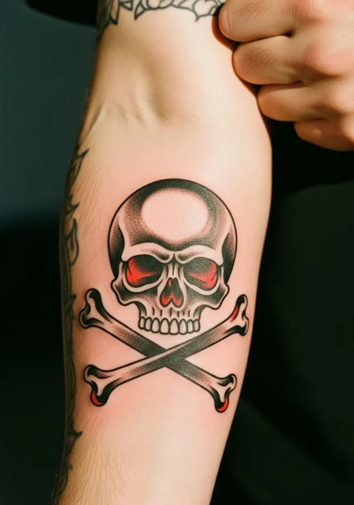 This timeless design features a skull and crossbones on the inner arm, drawn in crisp black ink with glowing red shadows that bring it to life. It s medium-sized, perfectly balanced, and feels like a nod to pirate lore and classic tattoo history. The clean, symmetrical placement makes it pop against the skin beautifully.