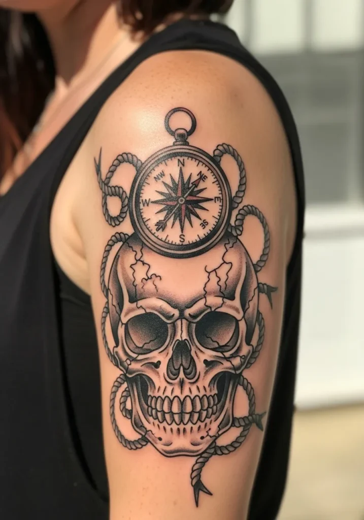 This upper arm tattoo blends a cracked skull with a detailed compass sitting above it, surrounded by winding rope elements that add texture and flow. The black ink shading gives the design incredible depth, while the crisp outlines keep it perfectly in line with classic American traditional style. The placement fits the shoulder beautifully, showing off every detail in natural light.