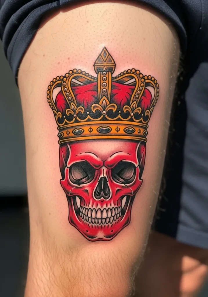 This vivid thigh tattoo showcases a red skull wearing a golden crown, bursting with classic American traditional color intensity. The solid black outlines and bold red and yellow tones make it stand out instantly. Its medium size works perfectly on the thigh, balancing detail and drama without feeling crowded.