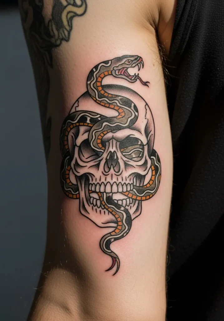 This upper arm tattoo features a coiled snake winding through the eye sockets of a skull. The scales are detailed with black, orange, and cream tones, while the skull itself is shaded in classic old-school fashion. The design flows naturally with the arm s shape, giving it a perfect fit.