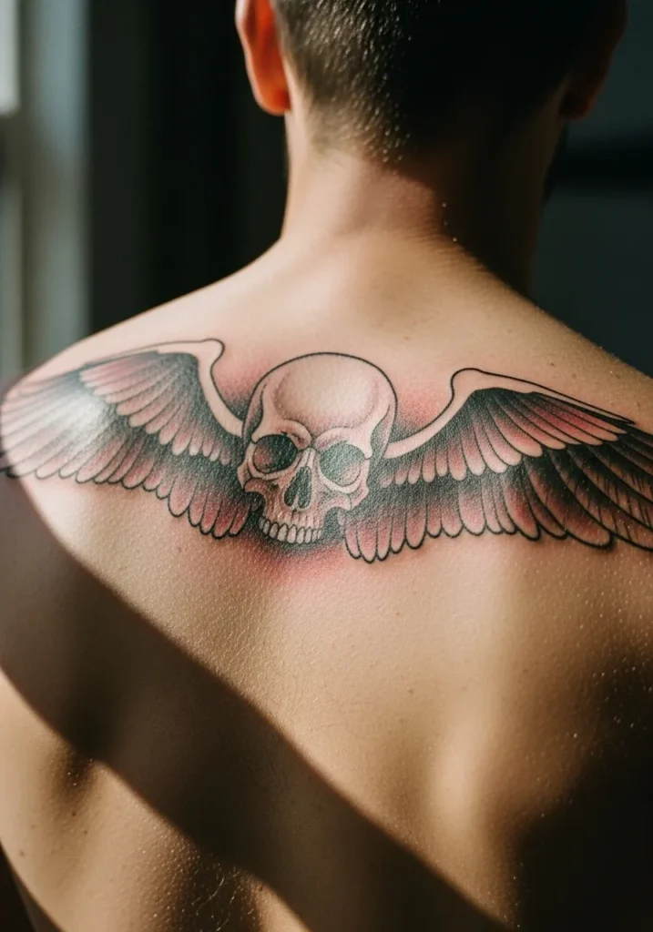 This stunning back tattoo features a skull with large, detailed wings stretching across the shoulders. The shading blends soft grays and muted pink tones that make it look ethereal under sunlight. The symmetry and size make it a bold yet graceful piece that commands attention.