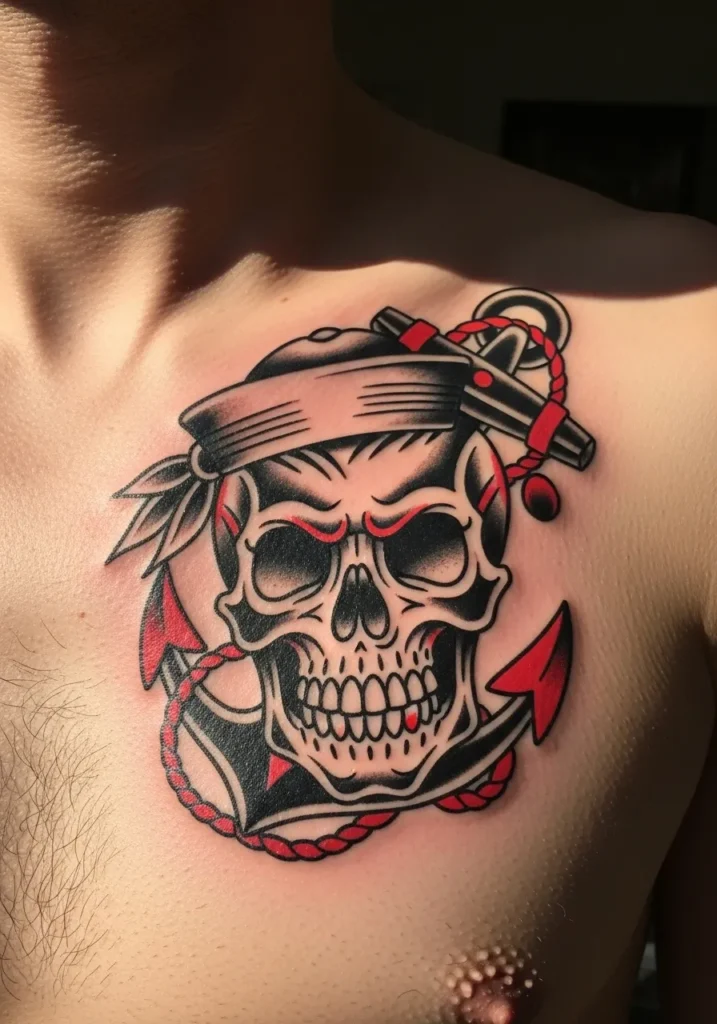 This chest tattoo combines a skull wearing a sailor s hat with a red rope-wrapped anchor behind it. The mix of black, red, and soft skin tones gives it that iconic American traditional vibe. The placement across the upper chest makes it bold and commanding without feeling overcrowded.