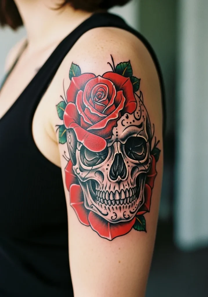 This upper arm tattoo features a beautifully shaded skull surrounded by blooming red roses and lush green leaves. The colors pop brilliantly, creating that bold and romantic American traditional aesthetic. The size and flow suit the shoulder perfectly, giving the whole piece a soft yet striking balance.