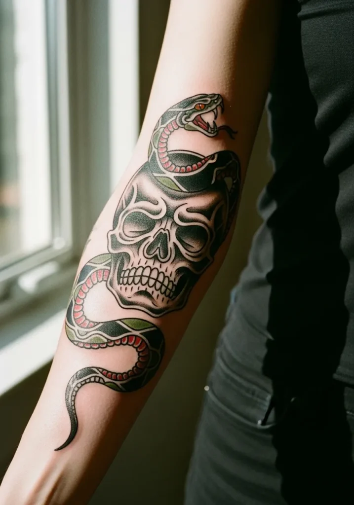 This bold American traditional design features a menacing green snake winding through a detailed skull, inked along the forearm. The tattoo has rich black shading with deep reds and greens that pop beautifully under soft daylight. It s medium to large in size, and the clean, solid outlines make it an instant classic. The fresh ink and slight redness around the skin give it that real-life depth that makes traditional art feel alive.