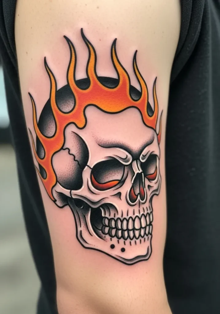 This fiery skull tattoo sits proudly on the upper arm, bursting with bright orange and yellow flames that frame a grinning skull. The heavy black outlines and bold gradients give it that authentic old-school feel, and the size makes it perfect for those who want something bold but not overwhelming.