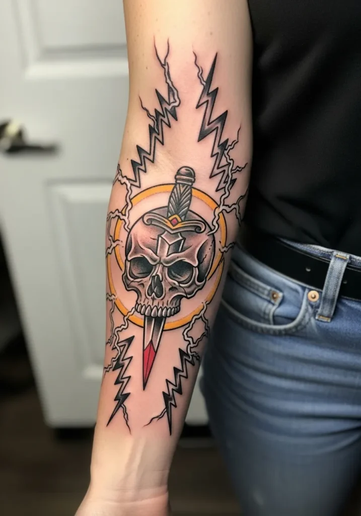 This forearm tattoo features a skull pierced by a dagger, surrounded by lightning bolts that crackle with energy. The bold black lines, yellow halo, and red blade create that eye-catching American traditional contrast. The placement along the forearm gives it a long, dynamic look that feels alive with motion.