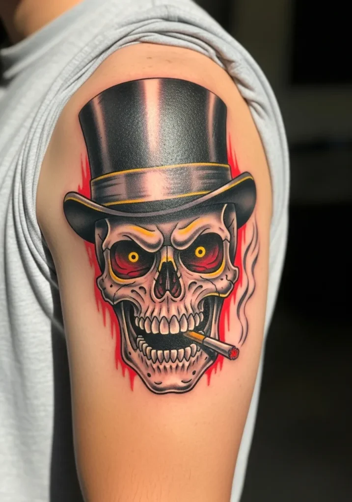 This eye-catching upper arm tattoo shows a grinning skull in a shiny black top hat, smoking a cigarette with glowing red eyes and fiery accents in the background. The high-contrast shading and sharp lines make it pop with that unmistakable old-school confidence.
