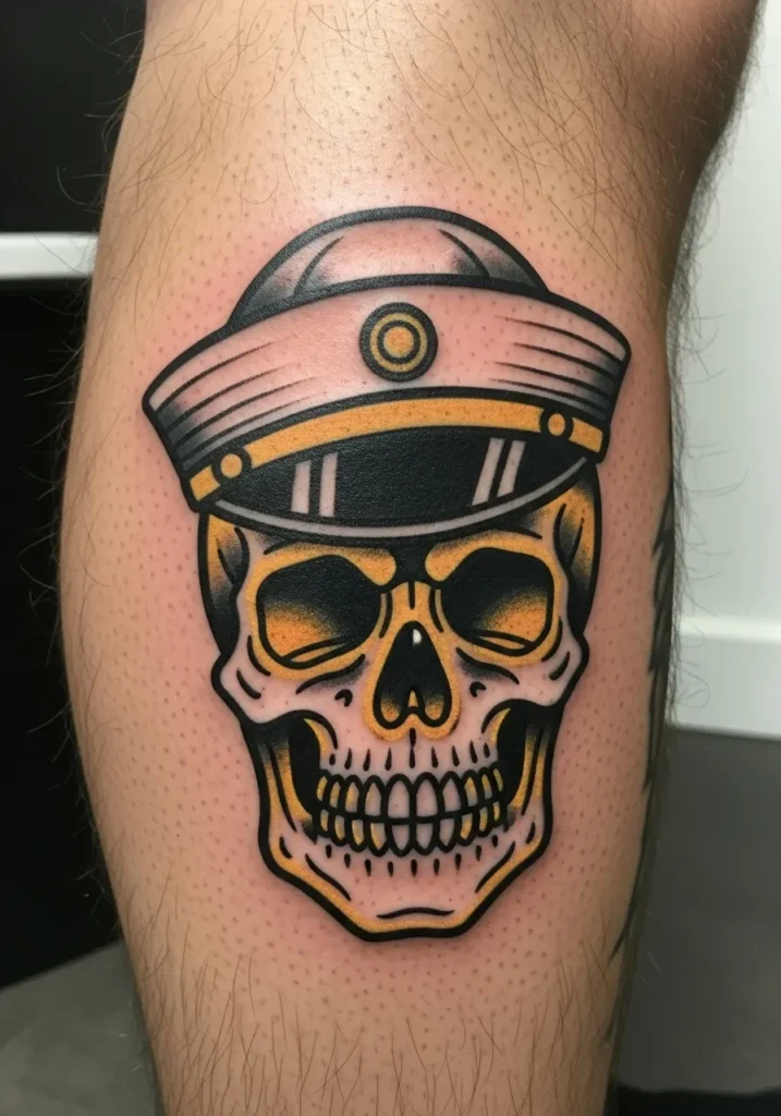This tattoo shows off a perfectly executed skull wearing a classic sailor hat, done in thick black outlines and bold gold shading. Placed on the calf, it has that old-school charm that screams traditional tattooing. The colors are warm and solid, giving it that nostalgic tattoo flash look that never goes out of style.