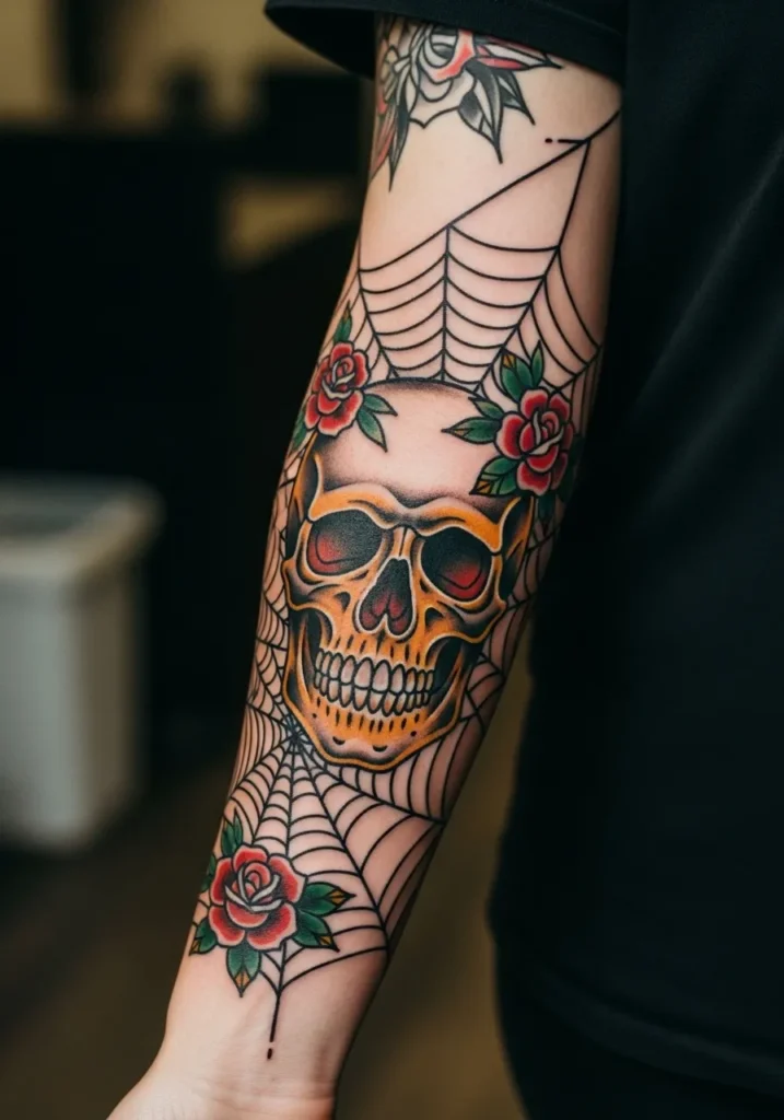 This beautiful forearm tattoo features a glowing orange skull framed by a spiderweb, with red roses blooming around it. The fine black outlines and smooth color gradients make it stand out against the skin, while the design fits naturally along the forearm. It s the perfect mix of spooky and sweet.