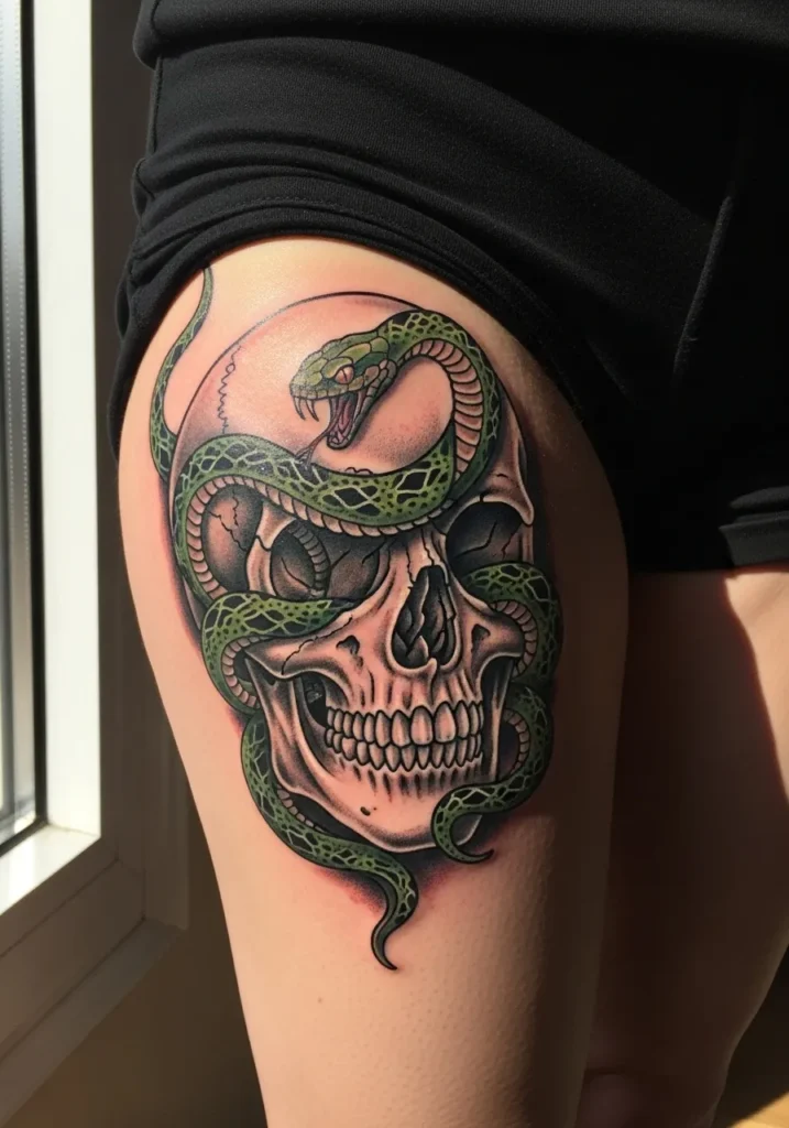 This thigh tattoo showcases a green snake weaving through a skull s eye sockets, inked in classic American traditional style with sharp black outlines and perfect color balance. The reds, greens, and soft shading create a sense of motion, making it look almost alive. The placement on the thigh gives it a powerful presence, especially under sunlight.