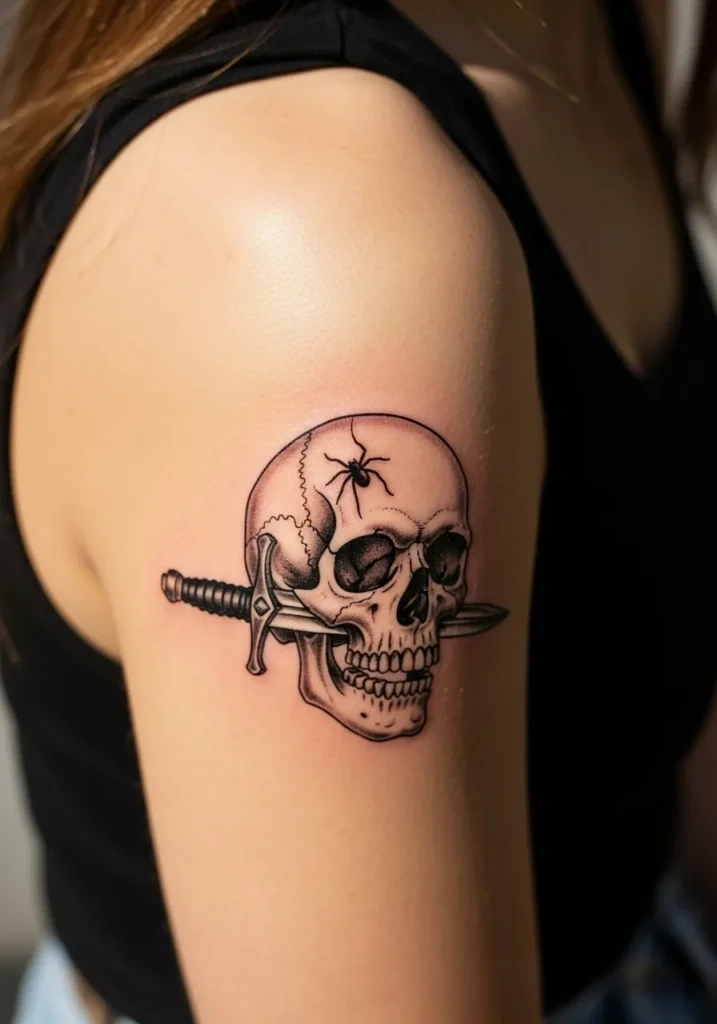 This small upper arm tattoo keeps it simple but striking, showing a clean black and gray skull pierced by a dagger, with a tiny spider crawling over the top. The minimal color palette highlights the fine shading work and old-school line precision. The smaller size makes it subtle yet intense a perfect choice for someone who loves understated ink.