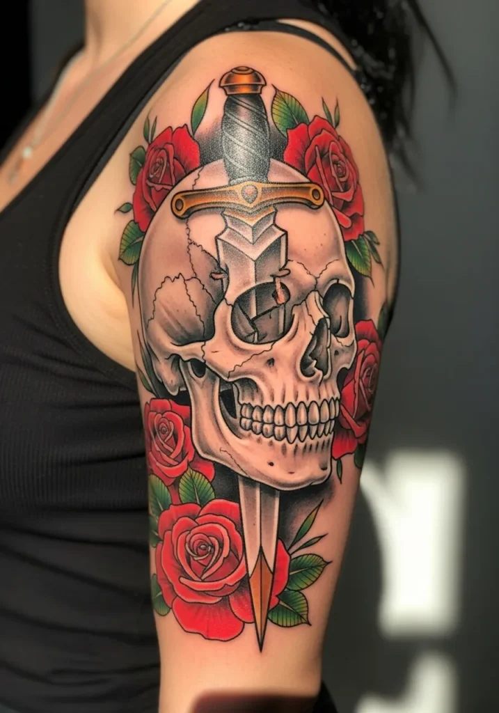 This striking upper arm piece features a detailed skull pierced by a silver dagger, framed by bright red roses with rich green leaves. The shading is beautifully soft, and the clean lines give it that unmistakable American traditional punch. The size fits the shoulder and upper arm perfectly, showing off both color and boldness in one view.