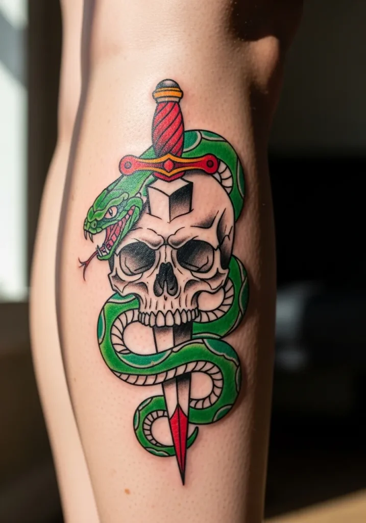 This leg tattoo features a detailed skull impaled by a dagger, with a vivid green snake wrapping around both. The red, green, and black color combo is classic American traditional, with perfectly even shading and clean outlines that make it look crisp and alive.
