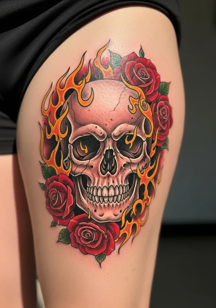 This bold thigh tattoo features a detailed skull surrounded by blazing flames and vivid red roses. The yellow and orange tones of the fire blend beautifully with the deep reds and greens of the roses, creating that perfect American traditional balance of heat and romance. The size fills the upper thigh just right, making it impossible to ignore without feeling too heavy.