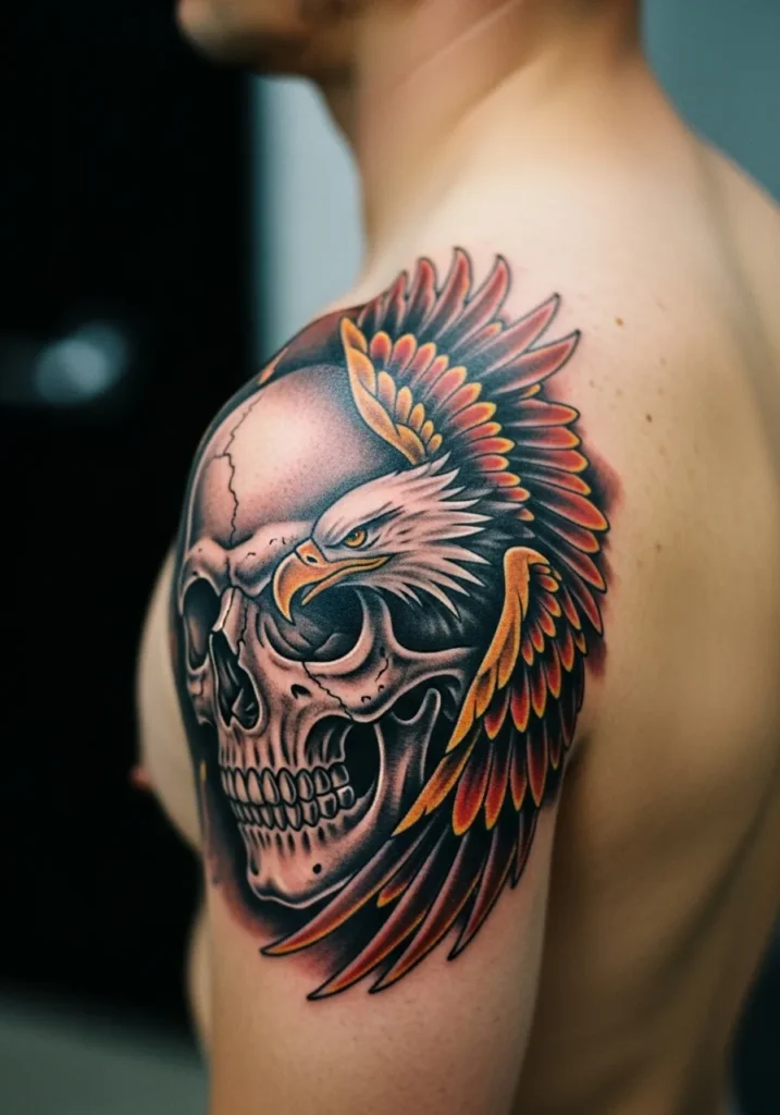 This powerful shoulder tattoo showcases a bald eagle swooping over a skull, its wings bursting with red, orange, and gold accents. The rich shading and crisp lines make the design look alive, with every feather perfectly placed. The placement wraps around the shoulder naturally, giving it a dynamic flow that s pure old-school tattoo magic.