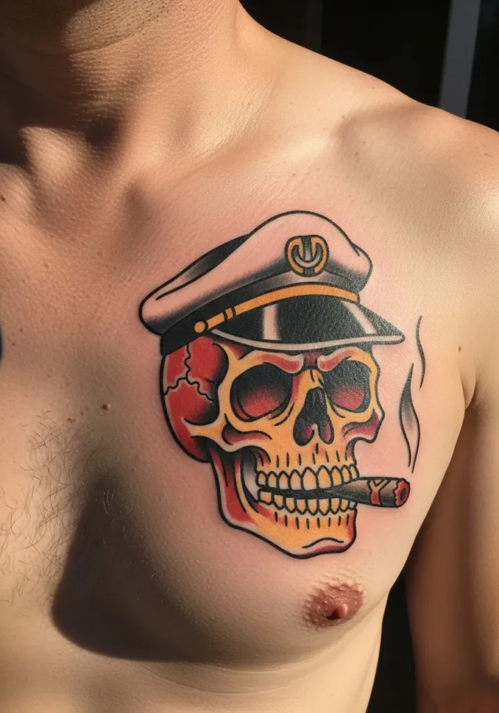 This chest tattoo shows off a grinning skull in a captain s hat, puffing a cigar with smoke curling upward. The shading and fiery orange tones make the skull glow under sunlight, giving it that classic vintage vibe. The placement on the upper chest makes it bold and commanding without being overwhelming.