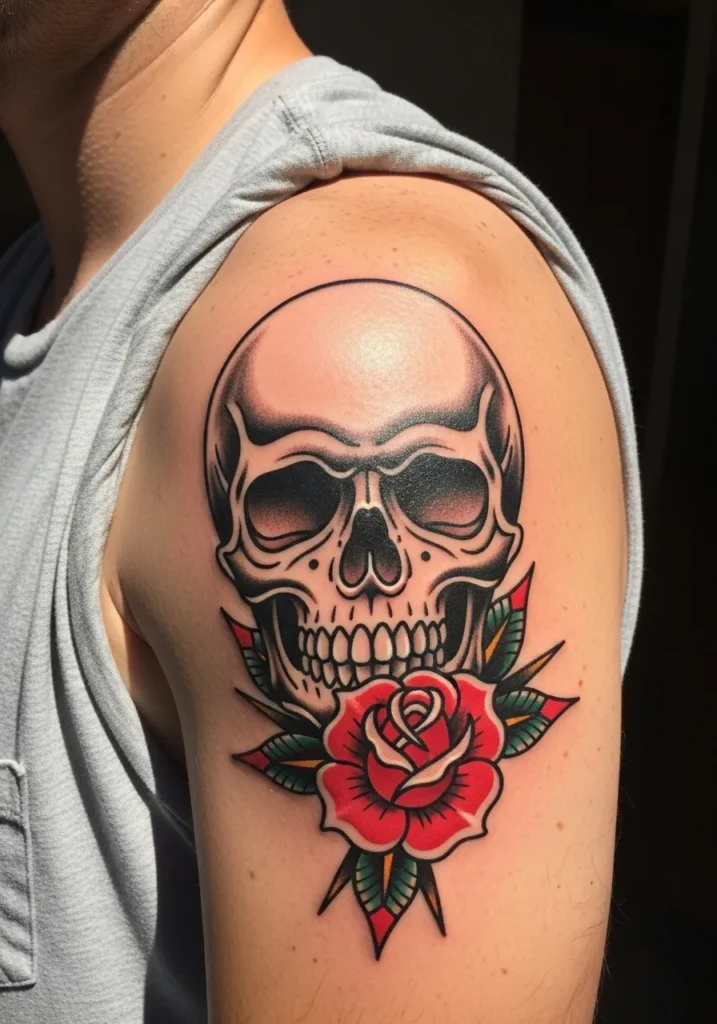 This shoulder tattoo keeps things beautifully classic with a detailed skull paired with a single red rose beneath it. The black shading and bright red petals create perfect contrast, and the composition fits neatly on the arm without overcrowding. It s a clean, bold, and beautifully balanced traditional piece.