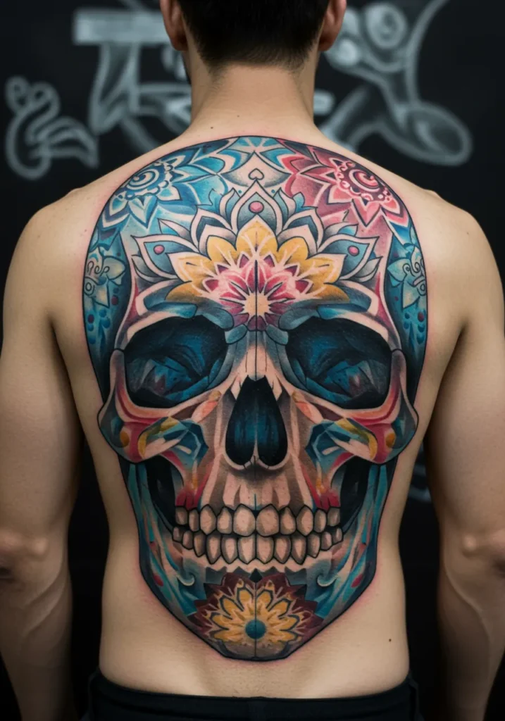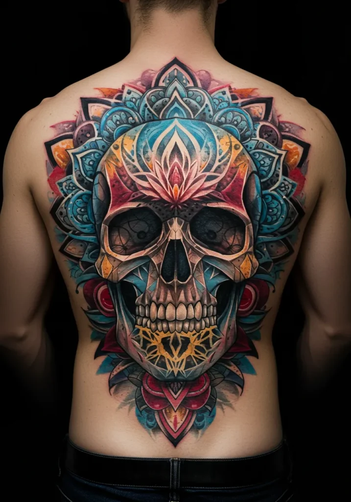 This breathtaking full back tattoo features a striking skull design perfectly centered within a vibrant mandala pattern. The skull itself is shaded with deep blacks and earthy tones, while the surrounding mandala bursts with bold blues, rich reds, golden yellows, and soft purples. Intricate geometric shapes and delicate linework bring balance and harmony to the piece, making the fierce skull feel almost peaceful. The soft watercolor-style shading around the edges ties everything together and gives the whole design this beautiful, flowing energy.