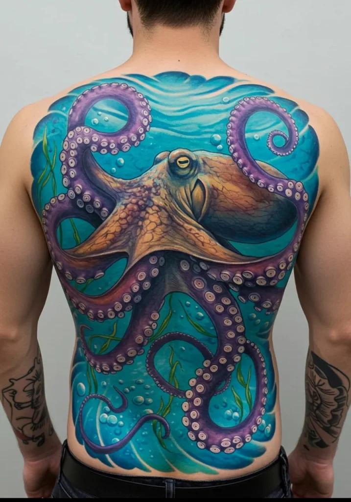 This colorful full back tattoo features a stunning octopus gliding gracefully through a vibrant underwater scene. The octopus is beautifully detailed with soft orange and purple tones, and its twisting tentacles fill the entire space in such a dynamic, flowing way. Bubbles, seaweed, and gentle waves surround the creature, adding movement and life to the background. The blend of turquoise blues and aquamarine greens in the water makes the entire piece feel bright and refreshing, like you re looking right into the ocean.