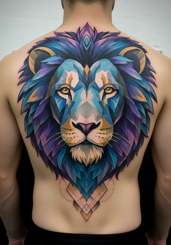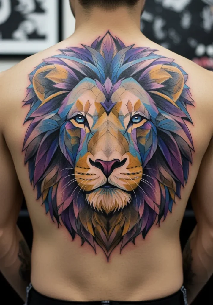 This bold full back tattoo features the face of a lion, brought to life through a stunning geometric design filled with rich purples, deep blues, warm yellows, and soft pinks. The mane is layered with sharp, angular shapes that give the piece a striking, almost crystal-like texture. Every line and curve flows perfectly into the next, creating a sense of balance and symmetry while still feeling wild and free. The lion s piercing blue eyes pull you right in, giving the whole design a calm but commanding presence.