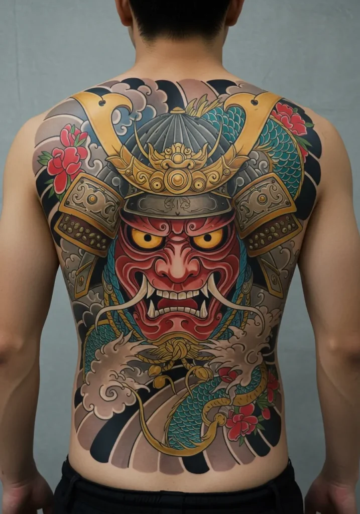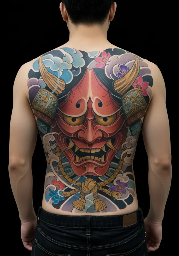 This bold full back tattoo features a dramatic red Oni mask, a classic figure from Japanese folklore, framed by swirling smoke, soft cloud patterns, and golden rope details. The mask s intense expression, wide eyes, and sharp fangs give the whole piece a fierce, commanding energy. The vibrant reds and yellows of the mask contrast beautifully with the cool blues and purples in the background, while the gold accents on the helmet and ropes bring in a touch of richness that ties everything together perfectly.