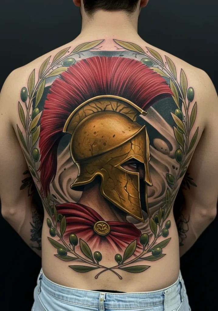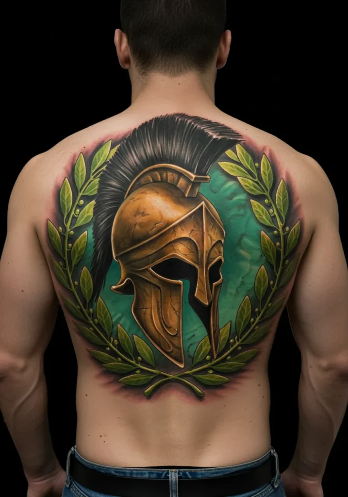 Spartan Helmet with Olive Wreath Full Back Tattoo