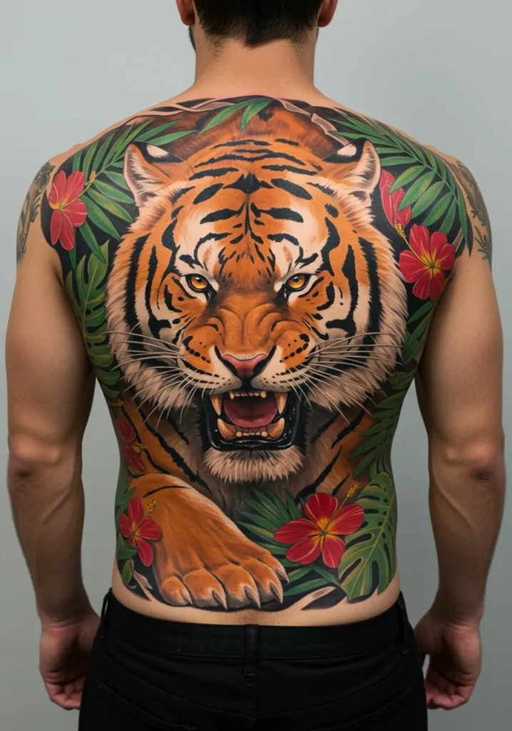 This powerful full back tattoo features a roaring tiger front and center, surrounded by lush green jungle leaves and vibrant red hibiscus flowers. The tiger s fur glows in warm orange and black stripes, with piercing yellow eyes that lock you in their gaze. Every detail in the face, from the delicate whiskers to the sharpness of its teeth, feels incredibly lifelike. The bold greenery and bright flowers framing the tiger add just the right pop of color to soften the intensity, making the entire design feel both fierce and beautiful at the same time.