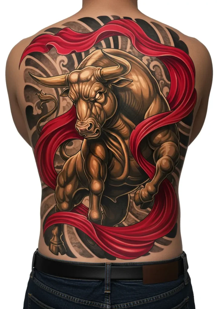 This bold full back tattoo showcases a powerful charging bull, muscles tensed and eyes locked forward, wrapped in vibrant red fabric that swirls dramatically through the design. The bull itself glows in golden brown tones with deep shading that brings out every curve and line of its strong build. Behind the bull, the background features abstract black and beige patterns that give the whole piece extra depth and motion, making it feel like the bull could leap right off the skin at any moment.