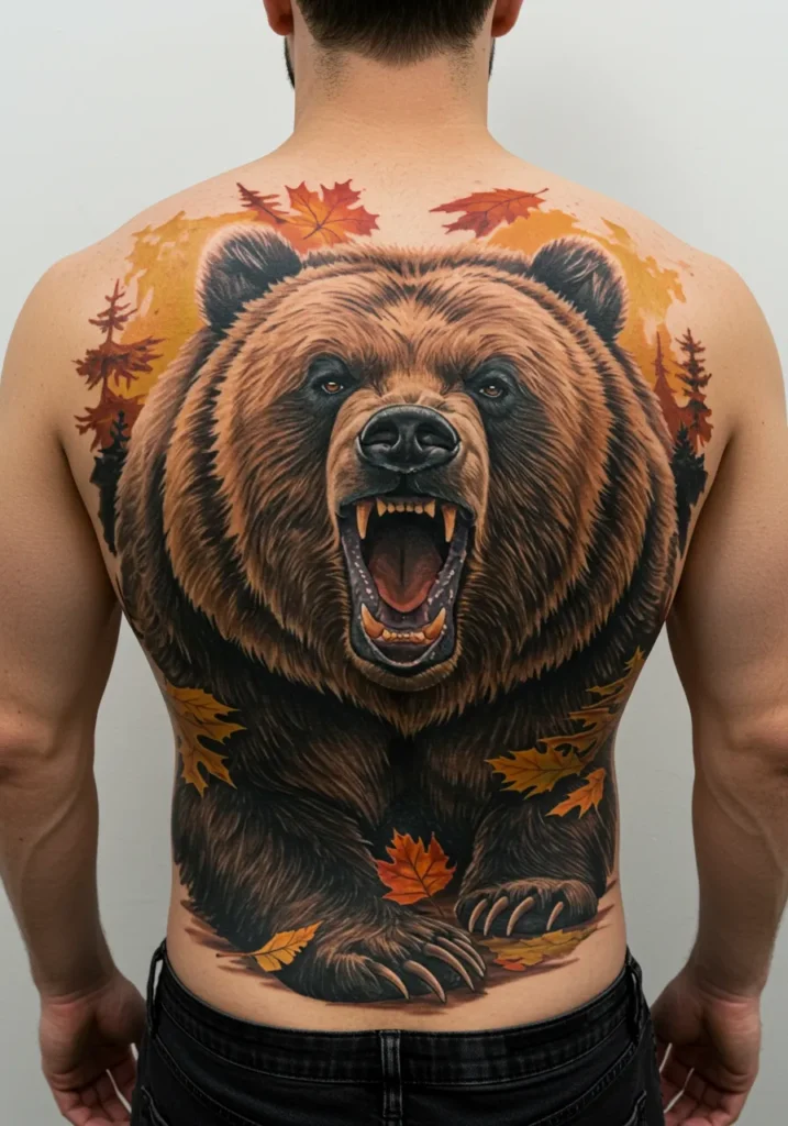 This fierce full back tattoo captures the raw power of a roaring grizzly bear, front and center, surrounded by autumn leaves and silhouettes of tall pine trees. The bear s thick fur is shaded with beautiful brown tones, and its wide-open mouth reveals sharp teeth and intense emotion. The falling leaves in reds, oranges, and yellows add a soft, natural contrast that makes the scene feel alive and wild. The background blends perfectly into the bear s shape, making the whole piece feel cohesive and bold without being too heavy.