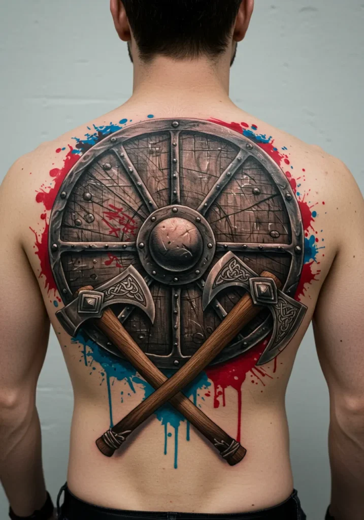 This bold full back tattoo features a rugged Viking shield at the center, its weathered wooden planks detailed with realistic scratches and metal studs. Crossing in front of the shield are two sharp battle axes, each carved with beautiful Nordic patterns on the blades. The background bursts with energetic splashes of red and blue ink, giving the entire piece a raw, battle-ready feel while adding a splash of color that keeps the design feeling alive and modern. The placement of the crossed axes draws the eye right to the heart of the design, making it feel perfectly balanced and fierce.