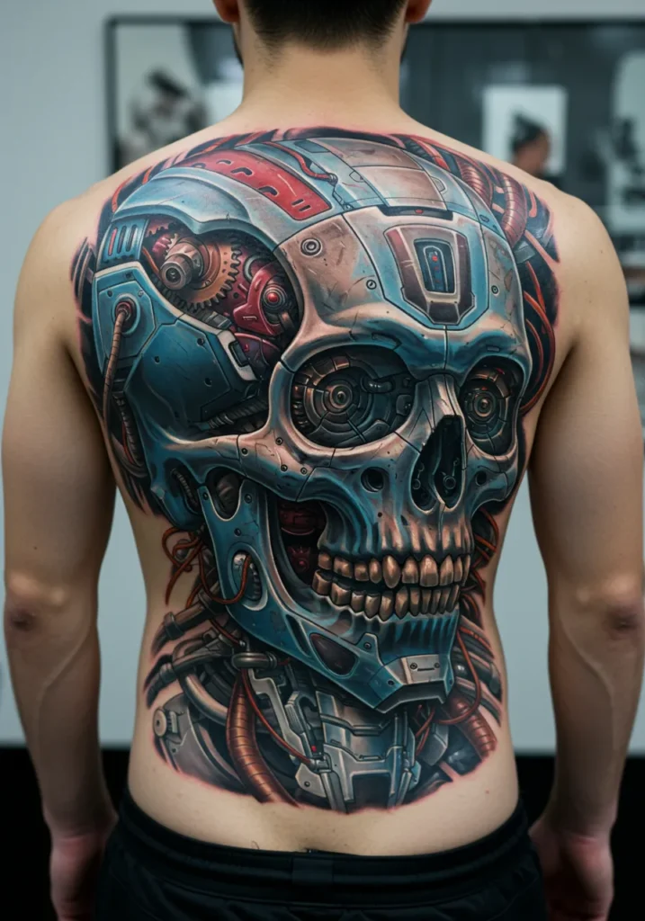 This epic full back tattoo features a hyper-detailed biomechanical skull, blending raw bone structure with metallic gears, wires, and futuristic armor plating. The design fuses cold steel blues and reds with the natural tones of the skull, giving it that perfect sci-fi meets anatomy vibe. Intricate gears, tubes, and mechanical components wrap seamlessly around the shape of the skull, making it feel like a true cyborg creation. Every inch of the piece feels alive with movement and power, like the inner workings of some dark futuristic machine.