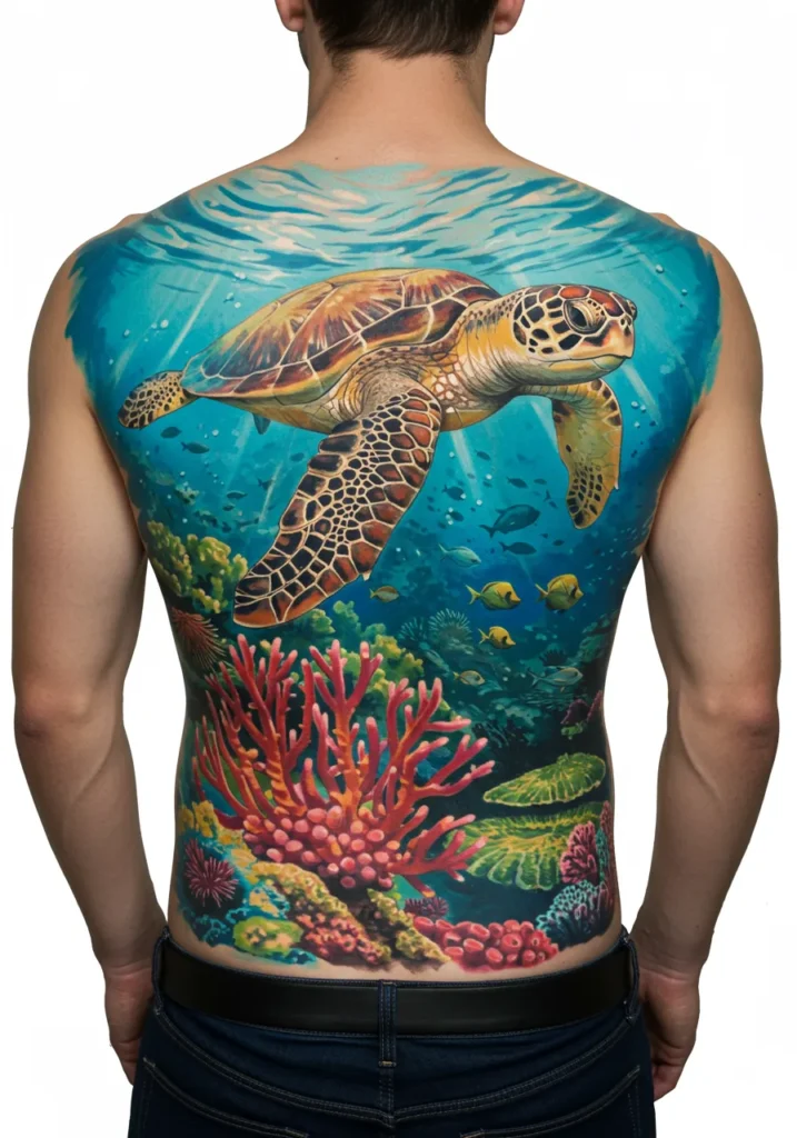 This stunning full back tattoo features a graceful sea turtle gliding through a vibrant coral reef, surrounded by colorful fish, sea plants, and beams of light filtering through the water above. The soft blues and turquoise shades of the ocean contrast beautifully with the warm reds, pinks, and yellows of the corals and sea life. Every detail on the turtle s shell feels rich and textured, with realistic patterns that make the design feel alive. The tattoo flows perfectly from the shoulders down to the lower back, creating a beautiful sense of depth and movement.