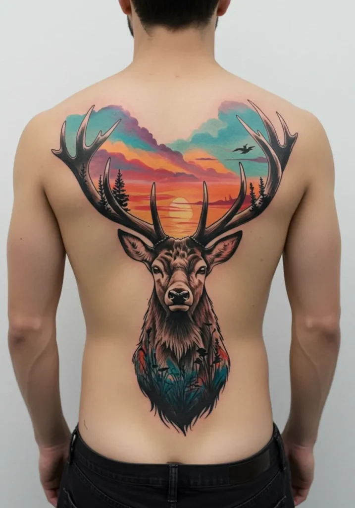 This gorgeous full back tattoo features the strong and noble head of a deer, with its impressive antlers framing a breathtaking sunset landscape. The sky bursts with soft pinks, warm oranges, and gentle blues, blending perfectly into the silhouette of pine trees and distant birds flying across the horizon. The way the scene is tucked between the antlers makes the whole design feel connected and intentional, like the deer and the land are part of the same story. Subtle shading and pops of color in the deer s fur tie everything together beautifully.