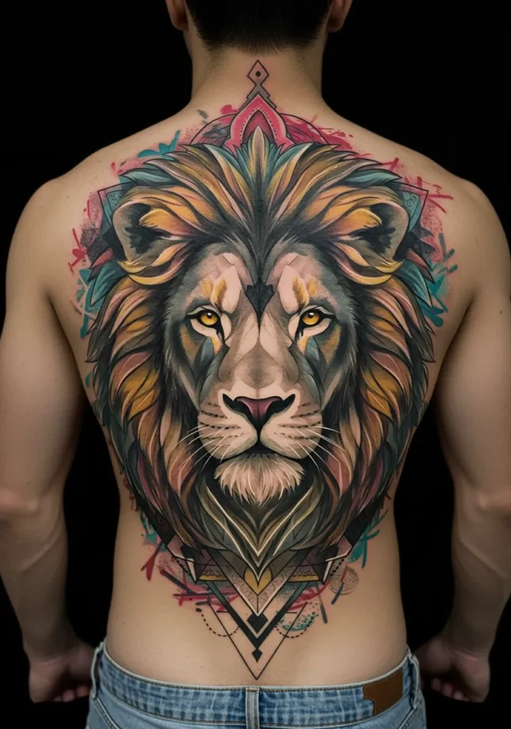 This stunning full back tattoo showcases the mighty face of a lion, brought to life with a mesmerizing geometric and watercolor fusion. The lion s intense golden eyes immediately draw you in, framed perfectly by a majestic mane filled with shades of gold, teal, and soft pink. The background adds even more energy with playful splashes of color and crisp linework that blends seamlessly into the mane. Sharp geometric shapes at the bottom give the piece balance and a modern edge, making the overall design feel bold, artistic, and completely unforgettable.