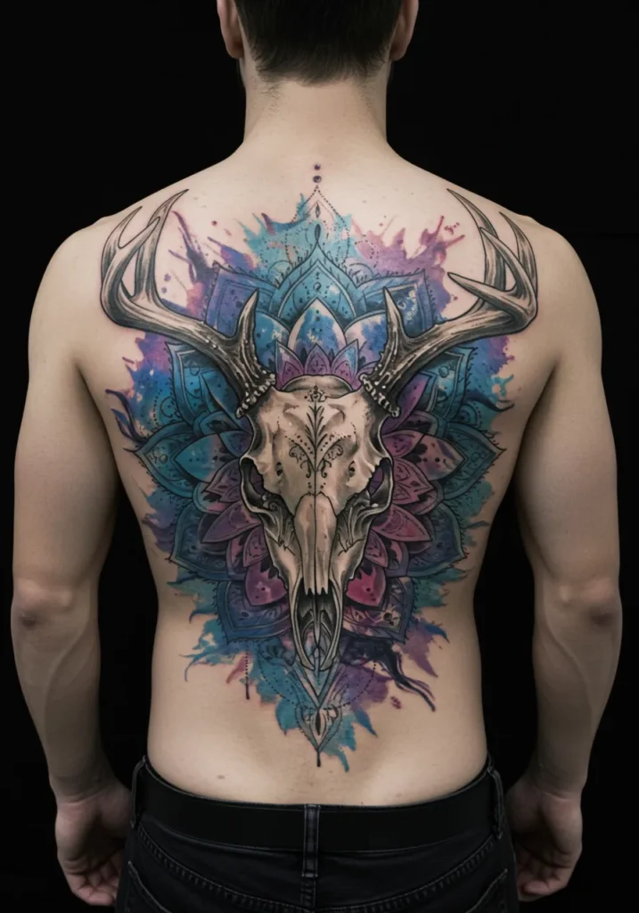 Deer Skull and Mandala Watercolor Full Back Tattoo