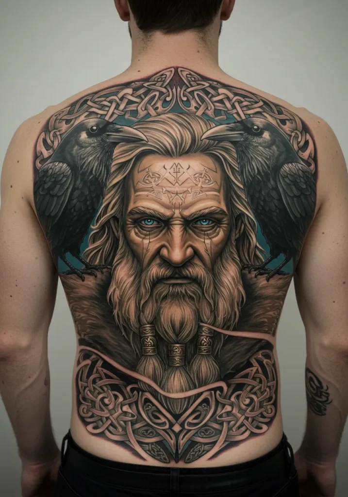 This stunning full back tattoo showcases a powerful portrait of Odin, the Allfather from Norse mythology. The design bursts with incredible detail, from the icy blue intensity of Odin s eyes to the flowing texture of his braided beard. Two majestic ravens, Huginn and Muninn, sit on either side of him, symbolizing thought and memory. Surrounding the central figure are intricate knotwork patterns that frame the tattoo beautifully and add to the authentic Nordic vibe. The soft shading and rich colors give the tattoo depth and life, making it feel like Odin himself is watching over.