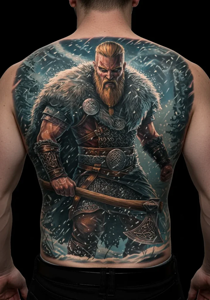 This bold full back tattoo captures a fierce Viking warrior standing strong in the heart of a blizzard. The design shows incredible detail, from the texture of the fur cloak and chainmail armor to the warrior s intense gaze and braided beard. Snow swirls violently around him, adding energy and movement, while the glint of his axe and the Nordic symbols etched into his gear bring an authentic touch to the piece. The backdrop of towering pine trees and a stormy sky makes the scene feel even more epic and raw.