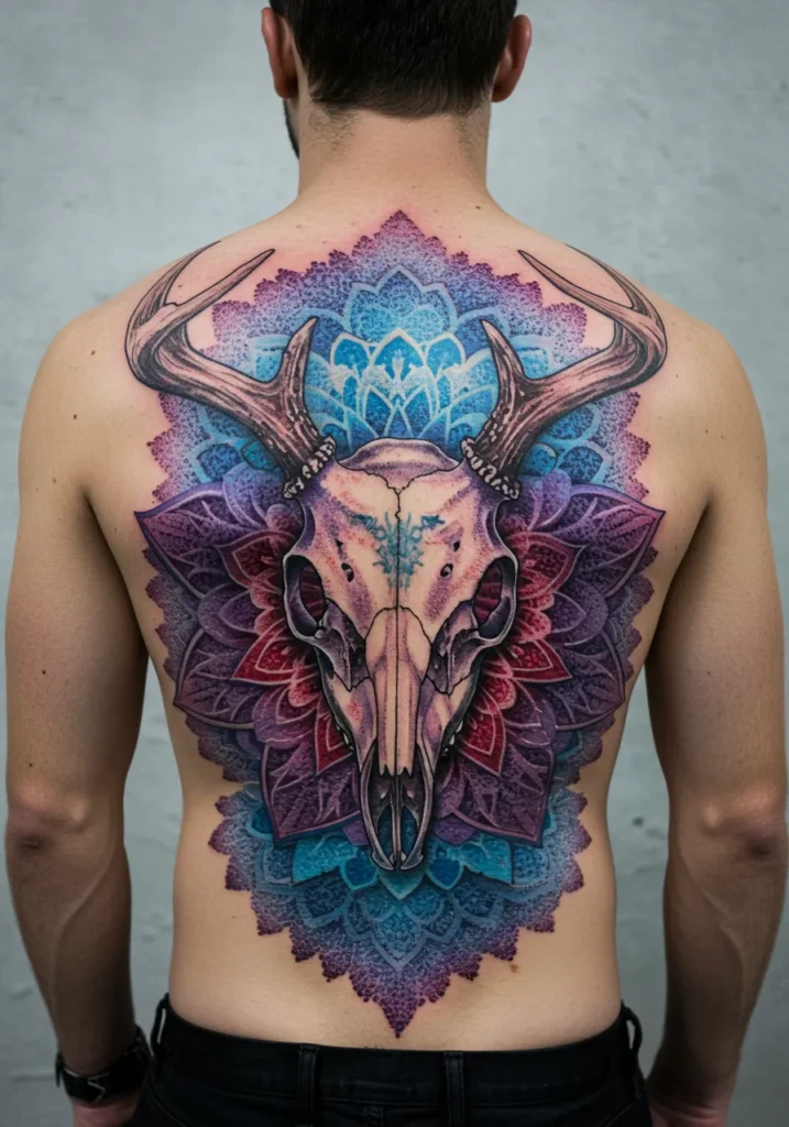 This stunning back tattoo blends the raw beauty of nature with sacred geometry, featuring a beautifully detailed deer skull centered against a large mandala backdrop. The skull, shaded in soft creams and subtle purples, feels almost lifelike while the antlers stretch outward with natural elegance. Behind it, the mandala bursts with layered lotus petals, transitioning from cool blues and teals at the bottom to rich purples and magentas near the top. The delicate dotwork throughout the design adds texture and depth, giving it a mesmerizing, almost hypnotic feel.