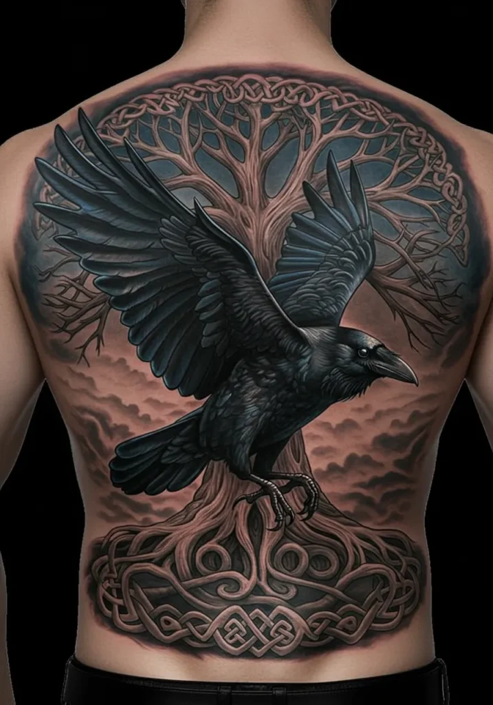 This stunning full back tattoo features a majestic black raven mid-flight, wings stretched wide in front of a beautifully detailed Yggdrasil tree. The tree s twisted roots and sprawling branches are framed by elegant knotwork patterns, bringing in that strong Norse mythology feel. The smoky clouds in the background add a soft, moody atmosphere that makes the raven stand out even more. The shading in the feathers is incredibly smooth, with just the right hint of blue highlights to give the bird a touch of magic without taking away its raw power.