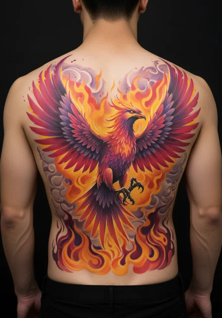 This dramatic full back tattoo features a powerful phoenix with wings spread wide, rising from a swirl of vibrant flames. The feathers glow in rich reds, purples, and fiery oranges, blending perfectly with the surrounding yellow and orange flames that climb up the back like waves of energy. Soft touches of smoke and violet hues balance the heat of the fire, creating a gorgeous sense of movement throughout the entire piece. The detail in the wings and claws gives the phoenix so much personality, making it feel both fierce and majestic.