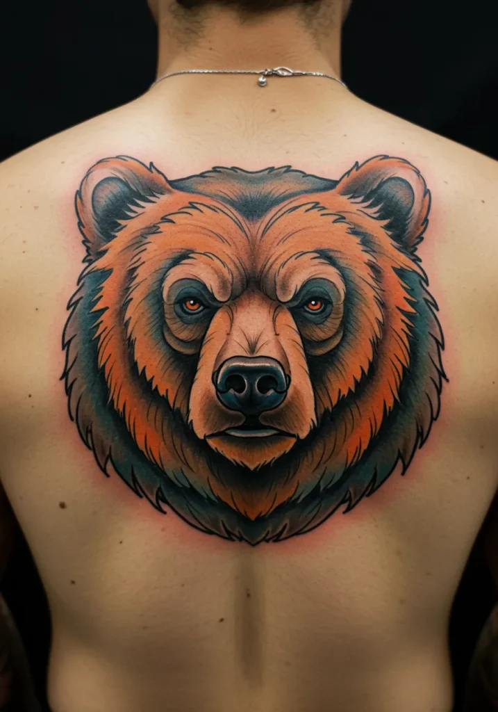 This bold back tattoo captures the fierce gaze of a bear, designed in a striking neo traditional style. The bear s face is rich with warm orange tones, beautifully shaded with deep blues and blacks that give the fur real depth and texture. Sharp outlines define every feature, from the intense, glowing eyes to the soft curve of the snout. The symmetry of the piece keeps it visually balanced, while the expression on the bear s face feels calm but commanding like it s watching and waiting, fully in control.