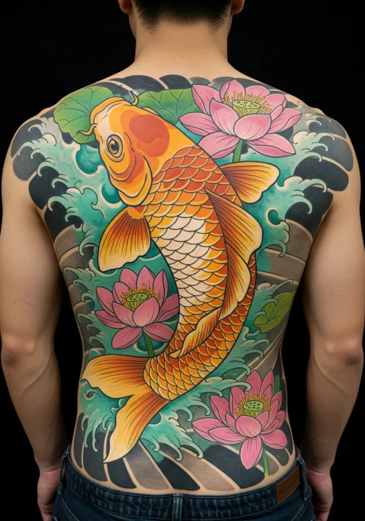 This gorgeous full back tattoo features a bright orange koi fish swimming gracefully through swirling waves, surrounded by soft pink lotus flowers and lush green lily pads. The design is done in a bold, traditional Japanese style, with crisp black outlines and rich, saturated colors that make the whole piece feel alive. The balance between the movement of the water and the still beauty of the lotus flowers creates such a lovely flow across the back. Every little detail, from the shimmering gold scales to the soft shading of the petals, adds depth and elegance to the artwork.