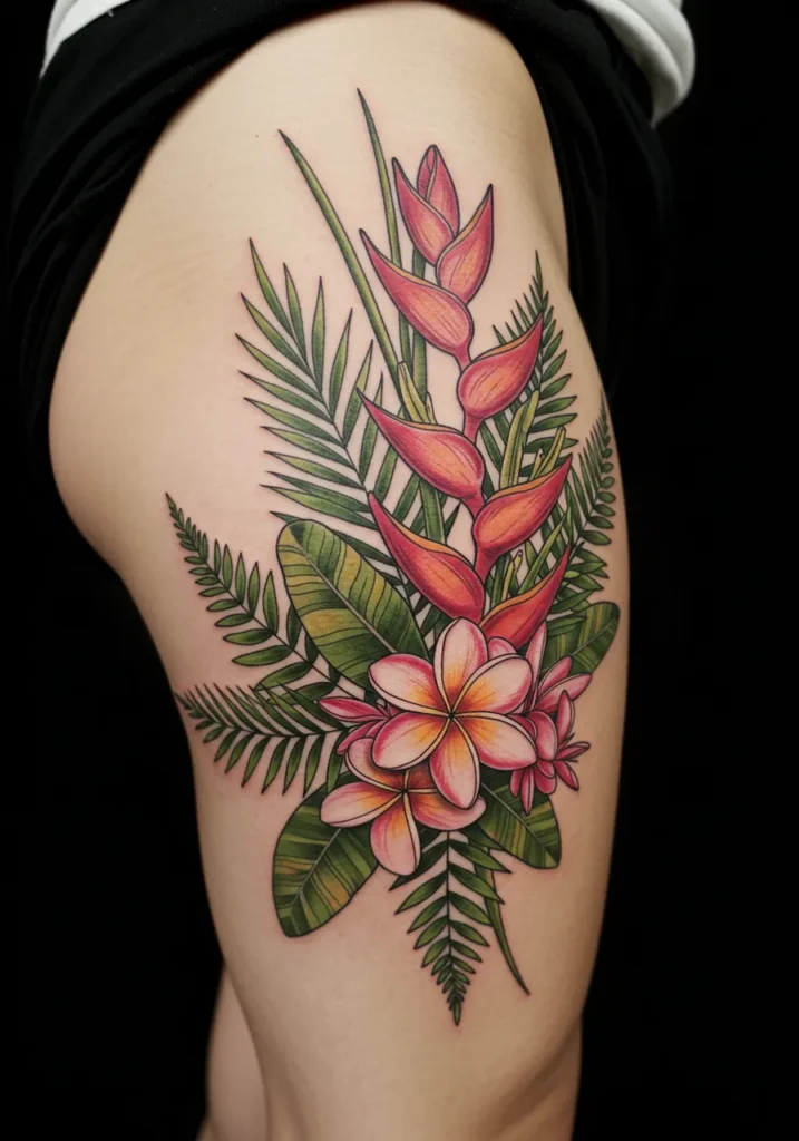 Plumeria and Heliconia Thigh Tattoo With Tropical Foliage