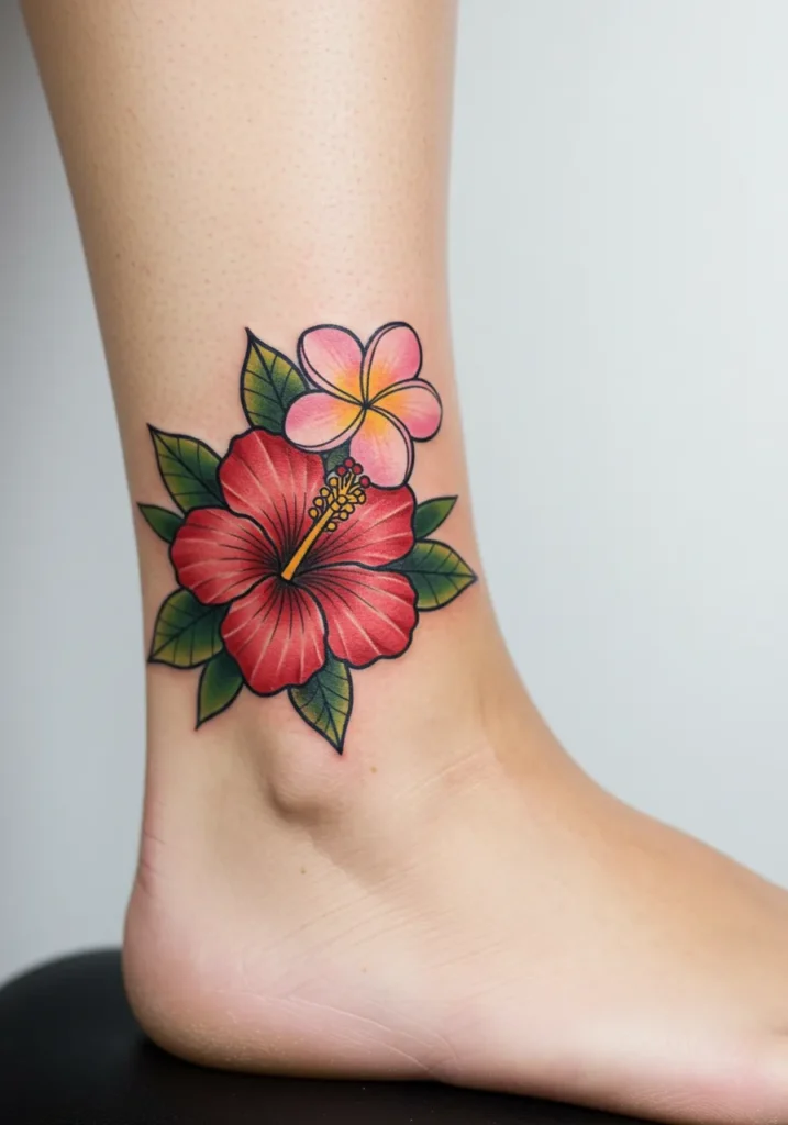 This playful little tattoo features a bright red hibiscus paired with a soft pink and yellow plumeria, surrounded by rich green leaves. It s placed perfectly just above the ankle, giving it that cute peek-a-boo vibe whenever you re in sandals or barefoot at the beach. The bold outlines and vibrant colors give it a classic, almost sticker-like charm, and the design is compact without feeling crowded.