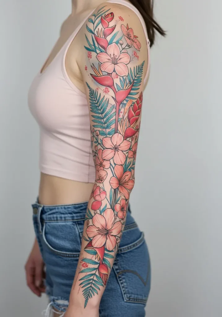 I m honestly obsessed with how soft and feminine this whole sleeve feels. It s bold without being too loud and colorful without going overboard. There s something so peaceful and confident about it. Like a wearable garden that says, I m calm, I m vibrant, and yes, I ve got my life together most days. Perfect for anyone wanting to make a statement with total tropical goddess energy.